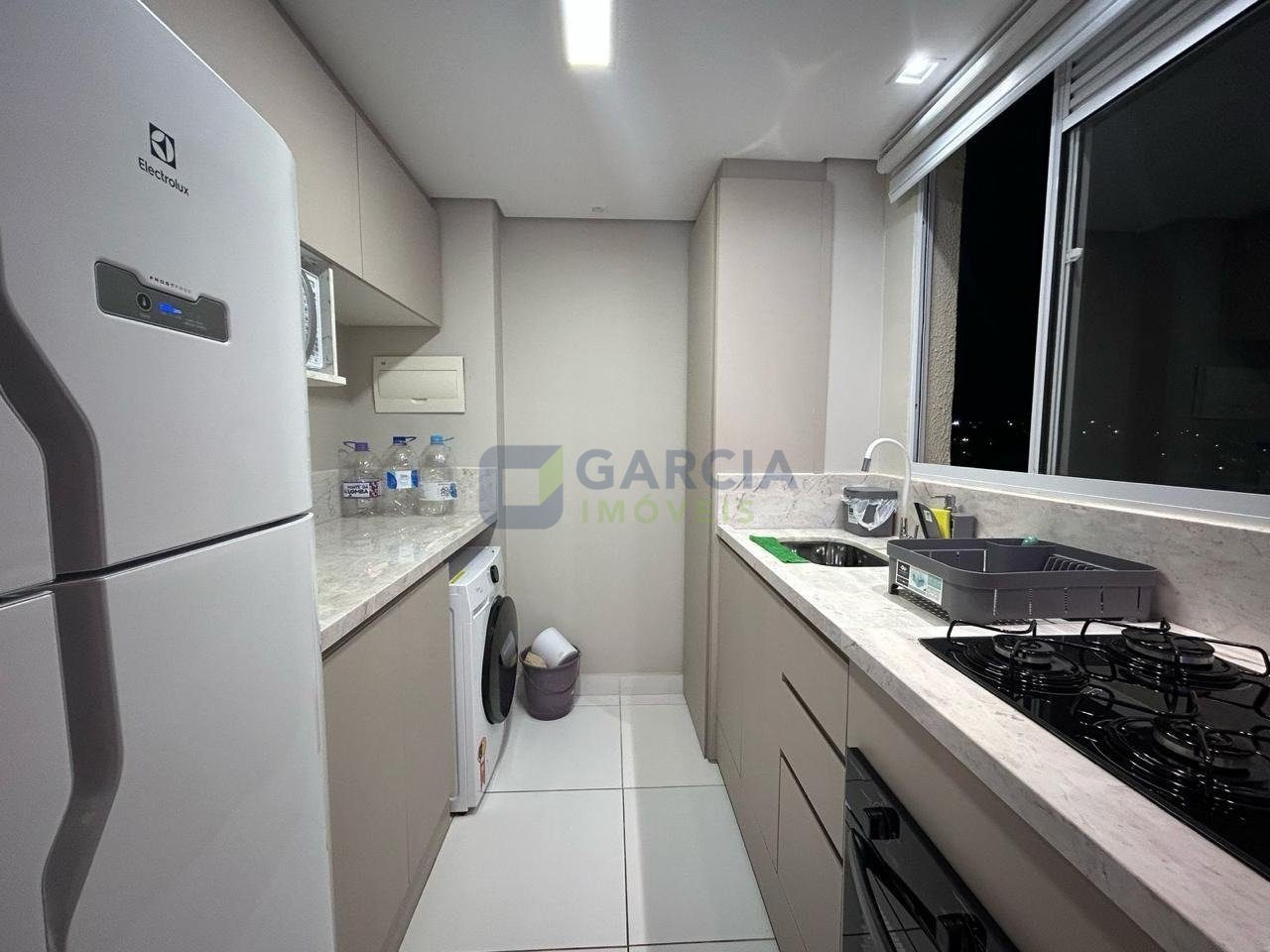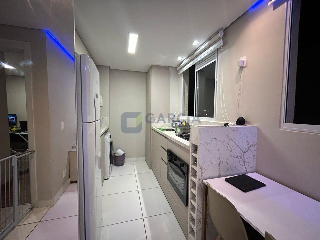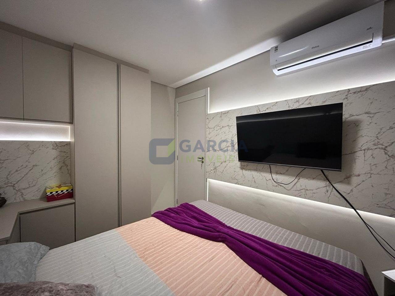 Mobiliado com painéis sob medida, iluminação em LED com controle, armários planejados, gavetão inferior, adega, bancada em L, sapateira e cabeceira com LED