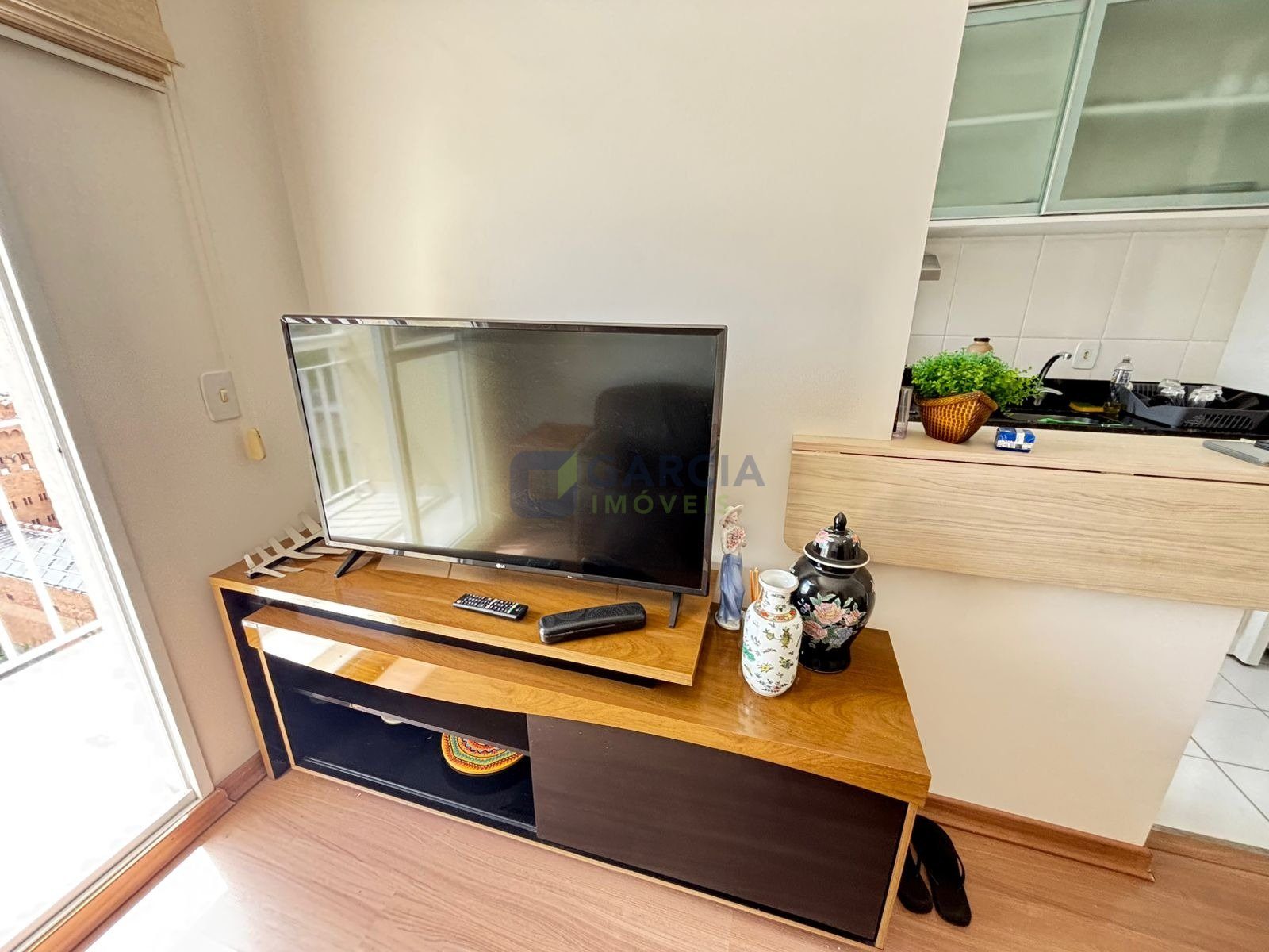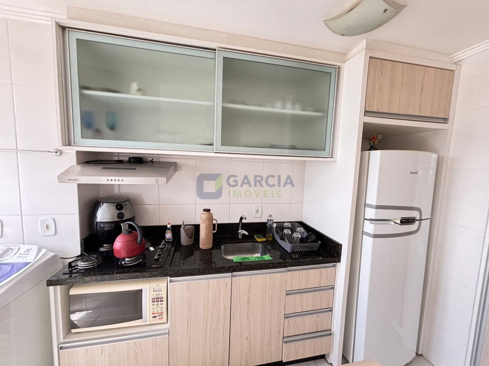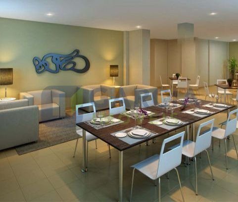 Com 52 metros quadrados, 2 quartos, sala com sofá, rack, mesa de vidro com 4 lugares, cozinha com balcão de pia e armário, micro-ondas, geladeira, fogão cooktop, sugar, área de serviço com maquina de lavar, banheiro social, um quarto com suíte com cama de casal e roupeiro, ar condicionado, segundo quarto com cama de solteiro e roupeiro.